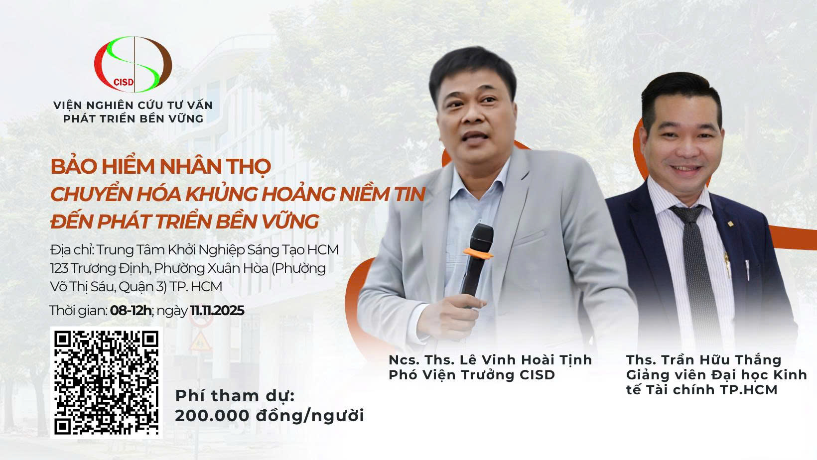 Ngành bảo hiểm nhân thọ đang đối mặt giai đoạn khủng hoảng niềm tin, đặt ra yêu cầu cấp bách về minh bạch và phát triển bền vững. Viện Nghiên cứu Tư vấn Phát triển Bền vững (CISD) tổ chức chuyên đề “Bảo hiểm nhân thọ – Chuyển hóa khủng hoảng niềm tin đến phát triển bền vững” vào sáng 11.11.2025 tại Trung tâm Khởi nghiệp Sáng tạo TP.HCM, 123 Trương Định, Quận 3.