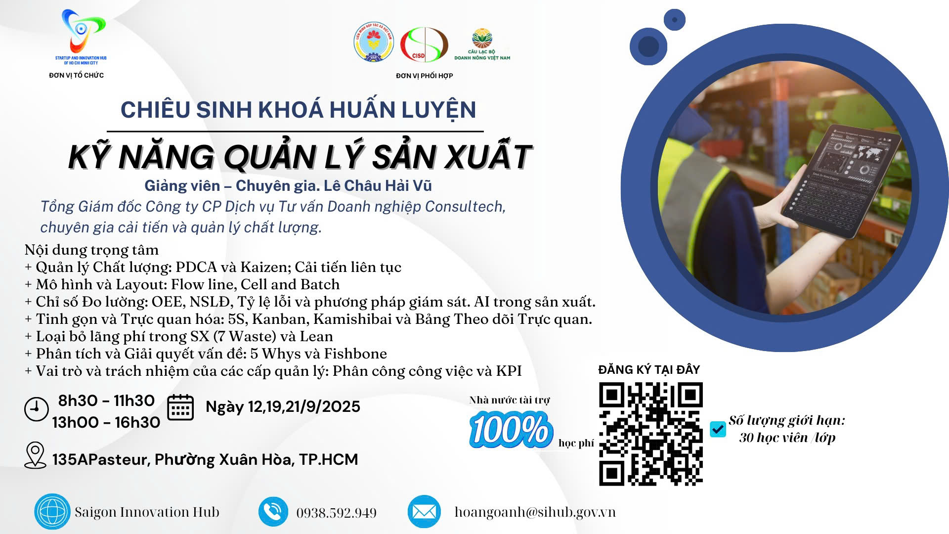 Trung tâm khởi nghiệp sáng tạo Thành phố hồ chí minh (SIHUB) phối hợp Viện Nghiên cứu Tư vấn và Phát triển bền vững (CISD), Liên minh hợp tác xã TPHCM, Câu lạc bộ Doanh nông Việt Nam cùng triển khai khóa Huấn luyện 3 ngày hoàn toàn MIỄN PHÍ, dành cho đại diện hội, hợp tác xã, làng nghề và cơ sở sản xuất tại TP.HCM. Mỗi lớp chỉ 30 học viên – đăng ký ngay để có được những kiến thức hữu ích.